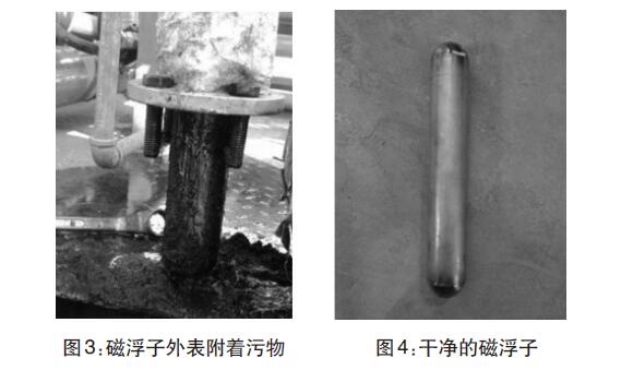 經(jīng)過(guò)兩年多運(yùn)行,污水罐內(nèi)可能沉淀污泥雜質(zhì)導(dǎo)致液位計(jì)示數(shù)不準(zhǔn)。現(xiàn)場(chǎng)拆卸液位計(jì),并且對(duì)浮球和磁浮子進(jìn)行清洗。(圖3-圖4)